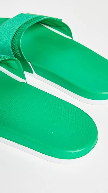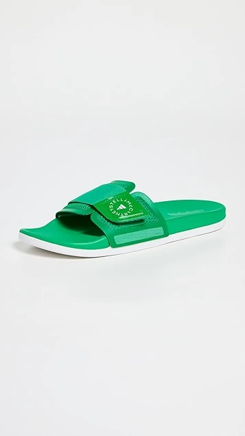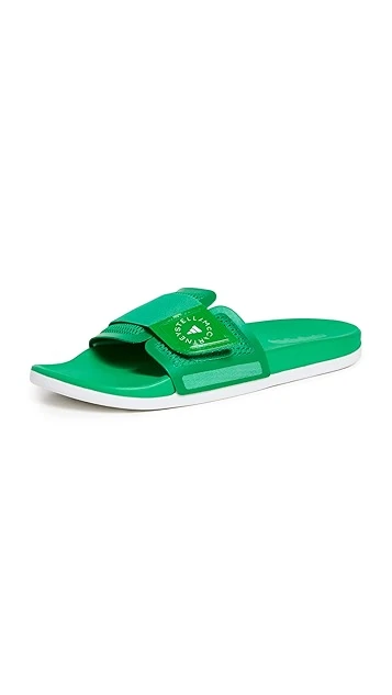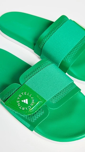 Sporty, comfortable, and cool, these adidas by Stella McCartney slides feature a vivid shade, mixed-media construction, and subtle logo lettering.