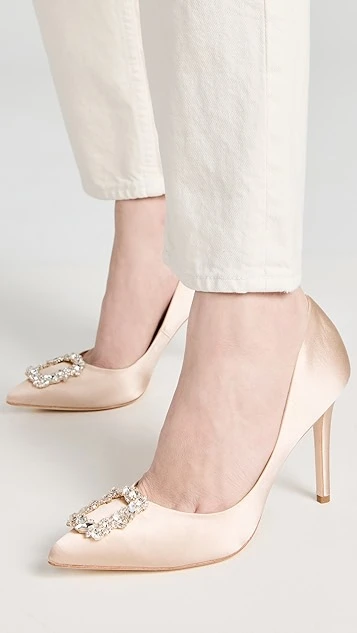 An assortment of bright crystals covers the front buckle of these sleek Badgley Mischka pumps, a timelessly polished pair in silky, light-colored fabric.