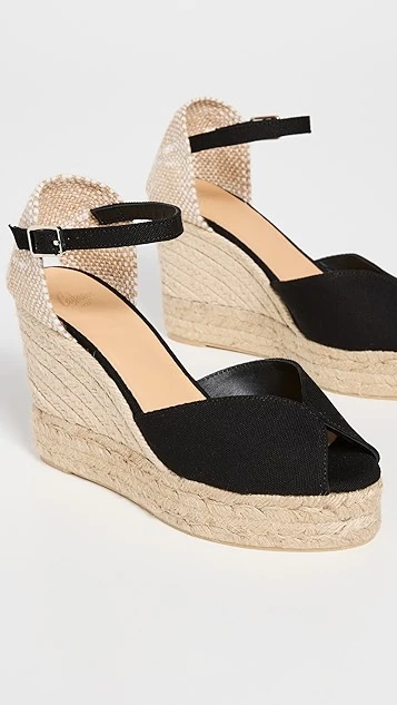 Designed with a significant wedge heel and an open toe, these Castaner espadrilles are a summery style that takes cues from special occasion shoes. Black canvas composes the upper, and a slender strap circles the ankle.