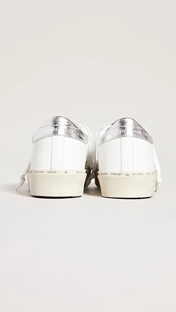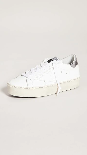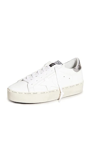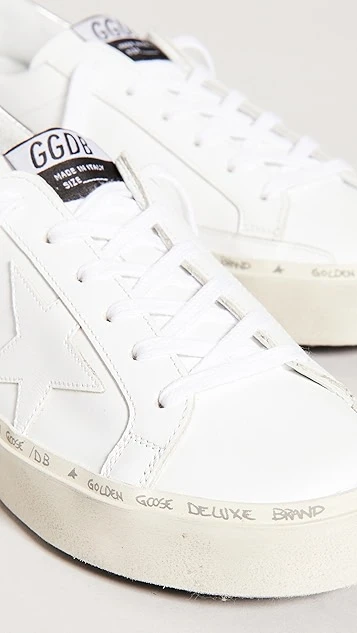 A signature pair with a little something extra. These Golden Goose Hi Star sneakers bring a fresh feel to classic white low tops with a slightly higher platform, metallic trim, and the label’s iconic doodle-style branding.
