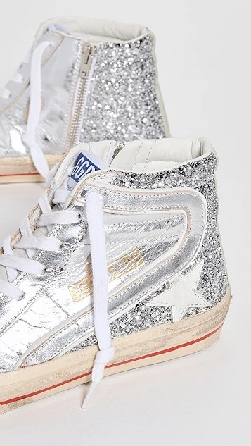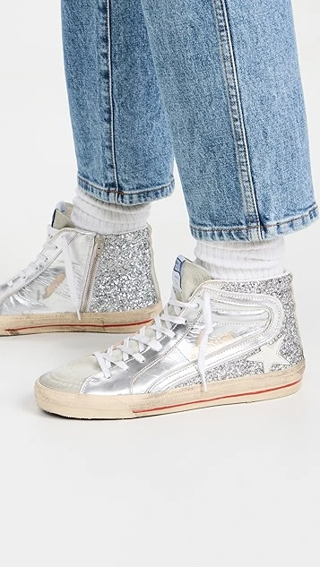 A favorite for off-the-clock looks, these Golden Goose sneakers update the signature Slide high tops with glitter trim and the brand’s usual scuffed finish for an edgy-luxe version of a must-have weekend pair.