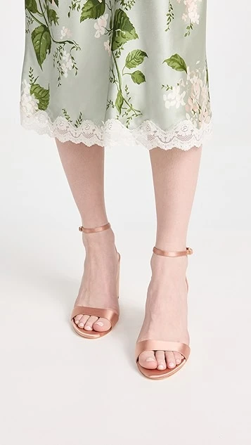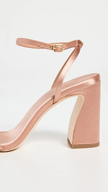 Sleek and shimmery satin in a blush-tinted shade composes these Loeffler Randall sandals, which feature a simple design with slender straps and a sturdy block heel.