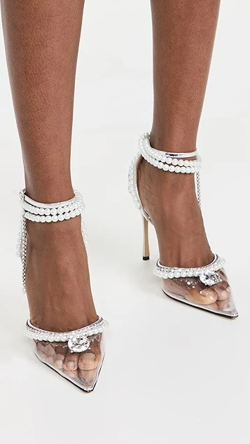 A special-occasion pair you’ll never forget, these MACH & MACH heeled sandals feature a pointed toe composed of transparent vinyl, as well as a complex strappy design with a mix of bright crystals and imitation pearls.