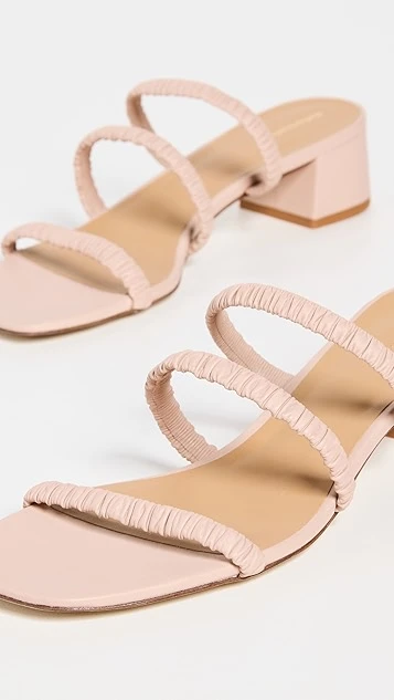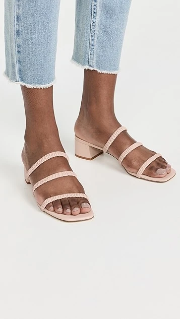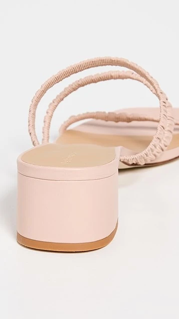 Understated and endlessly versatile, these lightly colored Reformation heeled sandals feature a trio of slender straps at the upper.