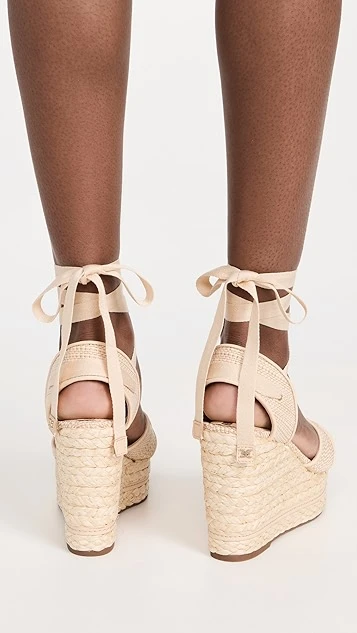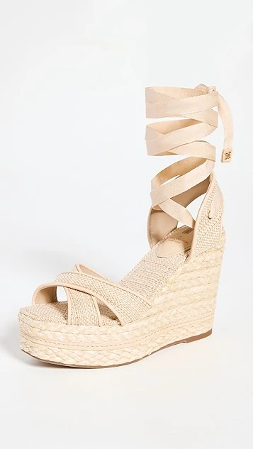 Providing a significant boost in terms of charm as well as height, these Sam Edelman wedge espadrilles are crafted from woven raffia and outfitted with a grosgrain ankle wrap.