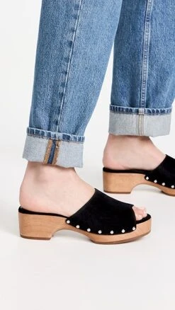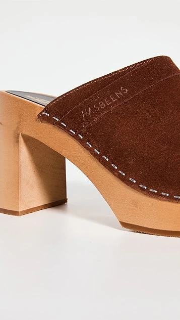 A stylish pair of Swedish Hasbeens clogs with a substantial heel, crafted from dark, earth-tone suede that’s subtly embellished with logo lettering.